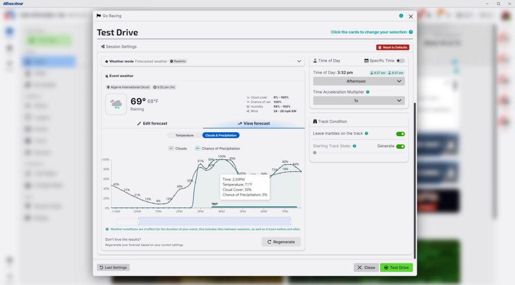 This weather option keeps it nice and simple. Choose your cloud cover, track moisture, temperature, wind speed, humidity, and fog, or let us set them automatically based on historical data in the area. Note that you can create a wet track with static weather, but in order to have falling rain, you must use Forecasted Weather.