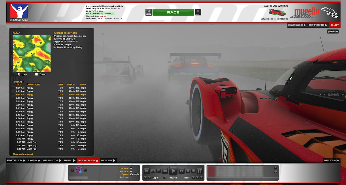 The all new in-sim weather tab shows the current radar and a forecast for the next several hours so you can plan your race strategy accordingly. Pop out the radar box for up to date radar at a glance.