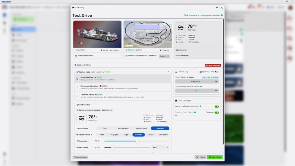 In the iRacing UI, you’ll have multiple weather options to choose from before starting your session, whether you’re doing a single-car test drive or hosting a session with your friends.