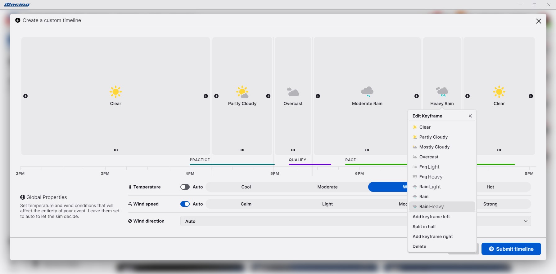 Map out your session (and even hours before it) down to the minute with our timeline editing tool. Add keyframes with the plus buttons and adjust their length with the sliders between them, then choose your temperature, wind speed, and wind direction before submitting your timeline.